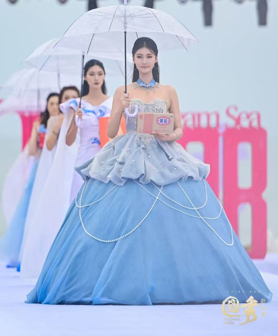 在那香海钻石沙滩T台上,五大新中式高定品牌联袂呈现山海有灵,天地毓秀的时尚盛宴。囍何、诗简、晒谷场·山海之间最新高定首秀,以衣载道,诠释亚洲顶级东方审美,与浩瀚沧海共谱美学新章;囍何以“女性的多面性”为灵感,打破传统时装对场景的局限,展现女性在家庭、职场与社交等多重角色中的流动魅力。诗简从东方水墨与书法艺术中汲取灵感,将东方写意精神与西方造型语言相融合,让世界看见东方之美。晒谷场·山海之间,以山峦层疊之态,衣摆如海浪起伏,行走间如携山海入世,于衣袂翻飞中触摸远古神话的呼吸。本土瑞莲祥品牌海遇系列服饰,则将千年海洋文化凝入当代设计,让传统在手作与创新中重获新生,它们共同织就的,是一场跨越时空的东方美学复兴。